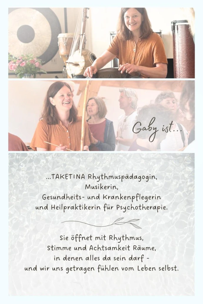 Gaby ist ……TAKETINA Rhythmuspädagogin, Musikerin, Gesundheits- und Krankenpflegerin und Heilpraktikerin für Psychotherapie. Sie öffnet mit Rhythmus, Stimme und Achtsamkeit Räume, in denen alles da sein darf - und wir uns getragen fühlen vom Leben selbst.