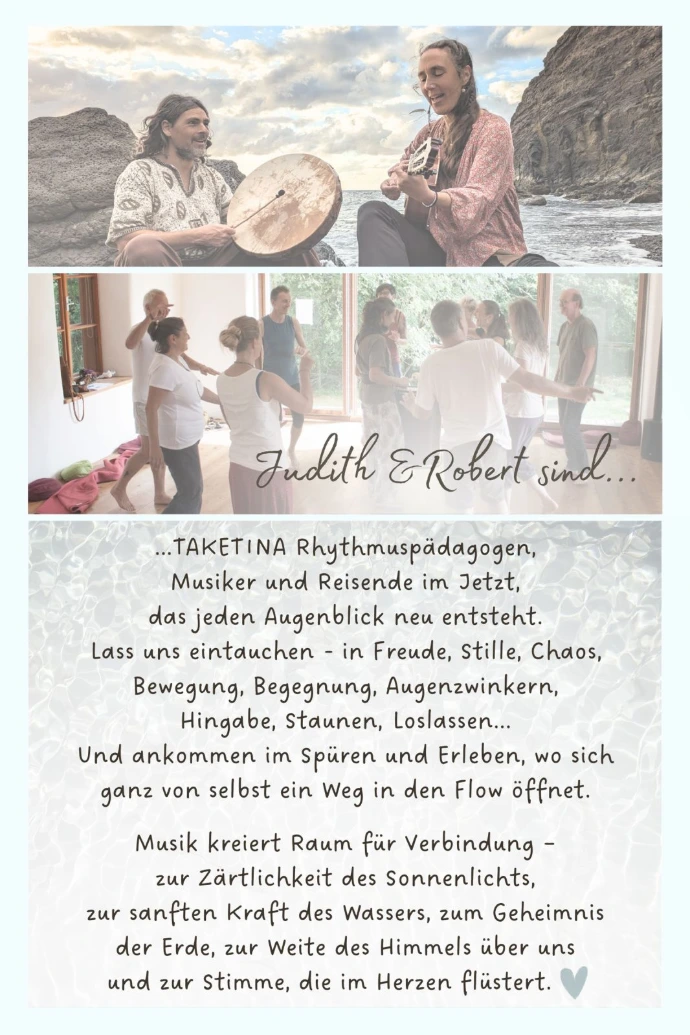 Judith & Robert sind…...TAKETINA Rhythmuspädagogen, Musiker und Reisende im Jetzt, das jeden Augenblick neu entsteht. Lass uns eintauchen - in Freude, Stille, Chaos, Bewegung, Begegnung, Augenzwinkern, Hingabe, Staunen, Loslassen… Und ankommen im Spüren und Erleben, wo sich ganz von selbst ein Weg in den Flow öffnet.